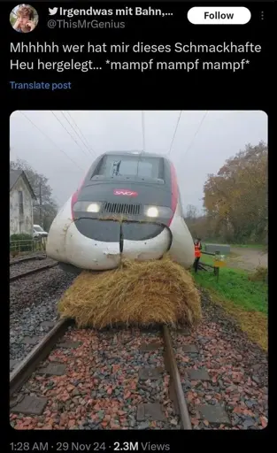 Not sure if German or train talking through mouthfulls of hay. Both?