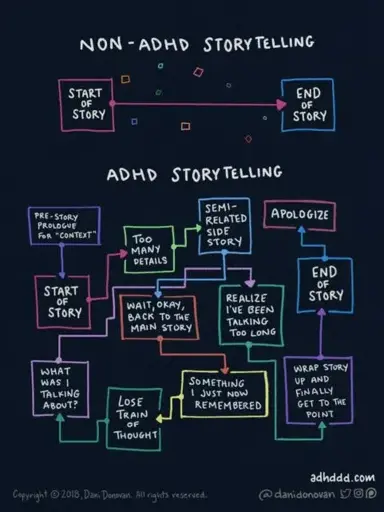 Might want to look into getting tested for ADHD if this resonates with you. This is a more accurate representation of how our brains work than the old “squirrel” joke.