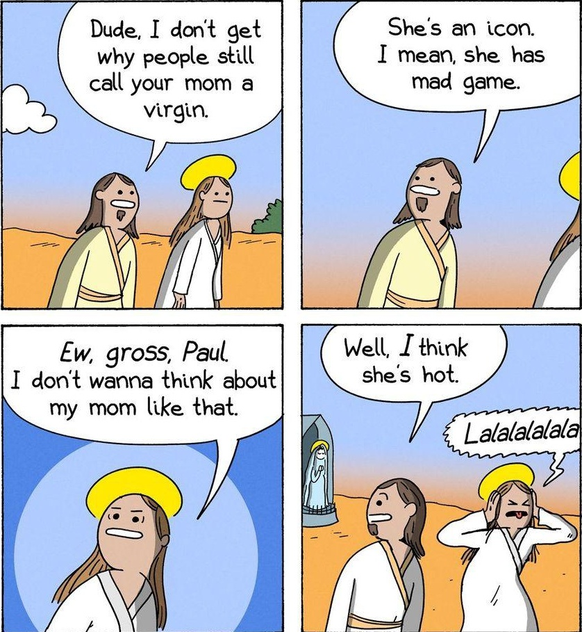 What Christians don’t want you to know is that Virgin just mean early-teens back in the day, and Mary was too Virginal. Hence the scandal. Someone sid that kid, no one wanted to admit it, so everyone agreed that it must have been a miracle.