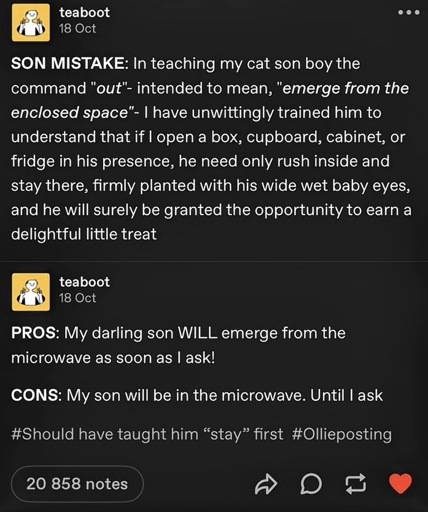 I’ve trained my cats to come to a dinner bell. Now, instead of yelling at me for food, the youngest cat has figured out how to ring the door chimes when he’s hungry.